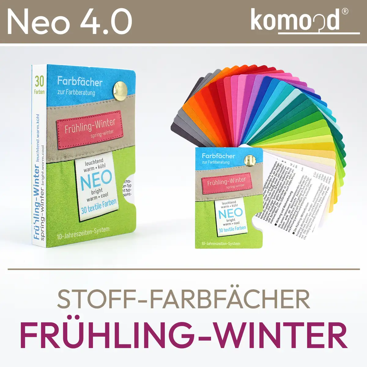 Pase de color de tela para el tipo de primavera/invierno - abanico de colores de la serie Neo con 30 campos de color de la paleta de colores de primavera/invierno - brillantes, cálidos, fríos. Producto de la tienda komood.shop