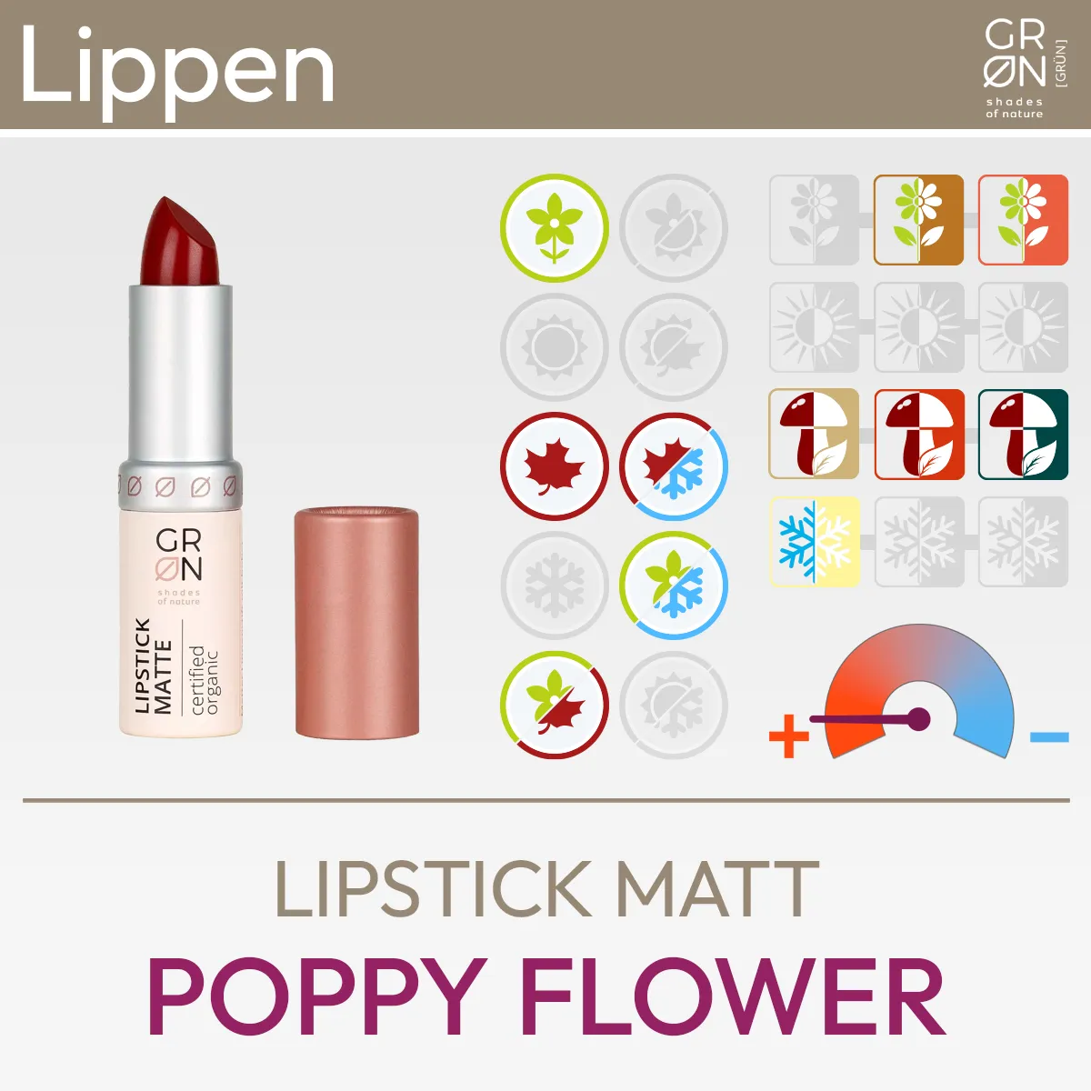 Présentation du produit pour le Lipstick Matt Poppy Flower de la marque GRN [VERT] comprenant une image du produit et un aperçu des symboles Komood pour lesquels les types de couleurs du système des 10 types de couleurs et du système des 12 types de couleurs sont particulièrement adaptés à la couleur de ce Lipstick Matt. Produit issu de la boutique komood.shop.