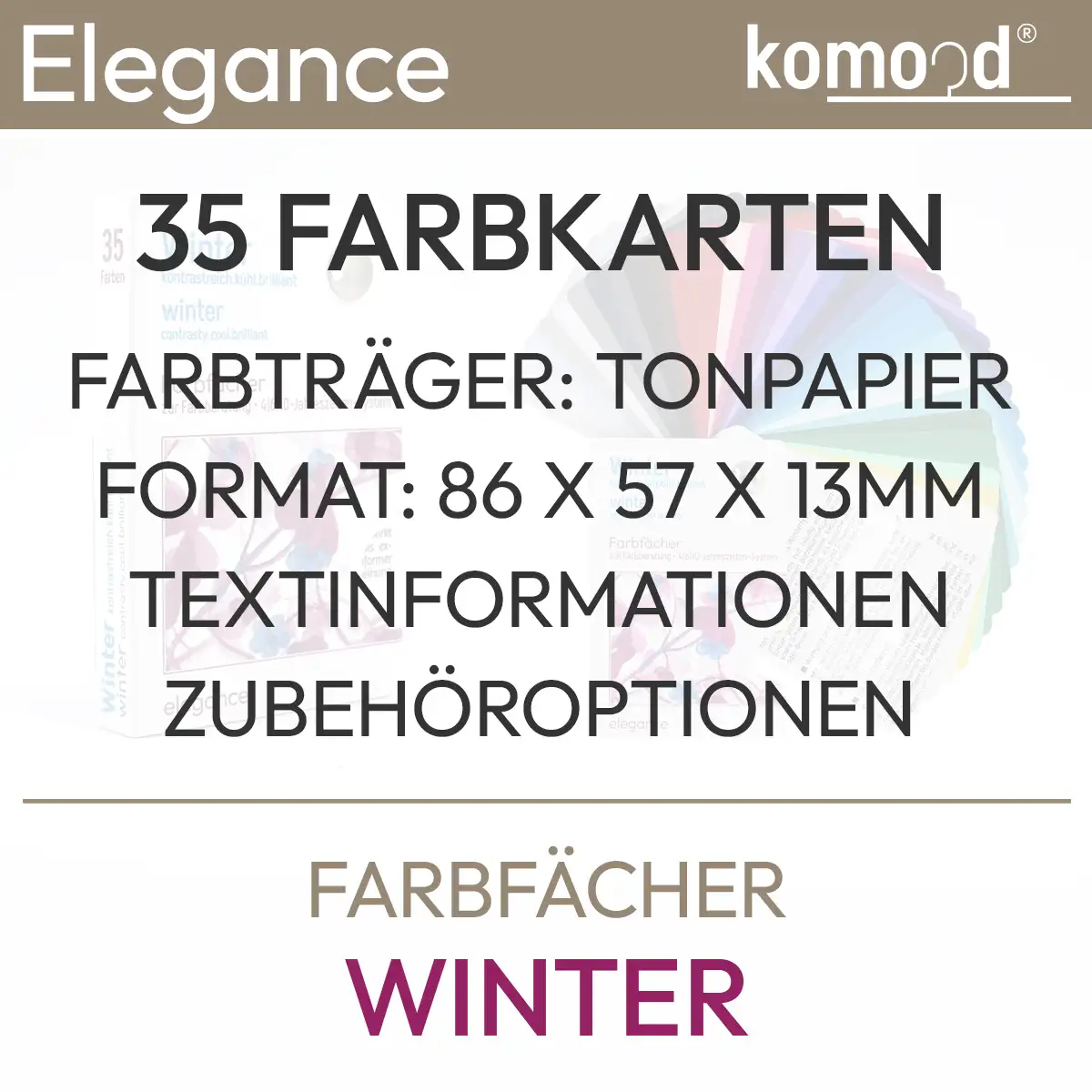 Farbpass für den Wintertyp - Farbfächer der Serie Elegance mit 35 Farbfeldern aus der Winter-Farbpalette - kontrastreich, kühl, brilliant. Produkt aus dem komood.shop